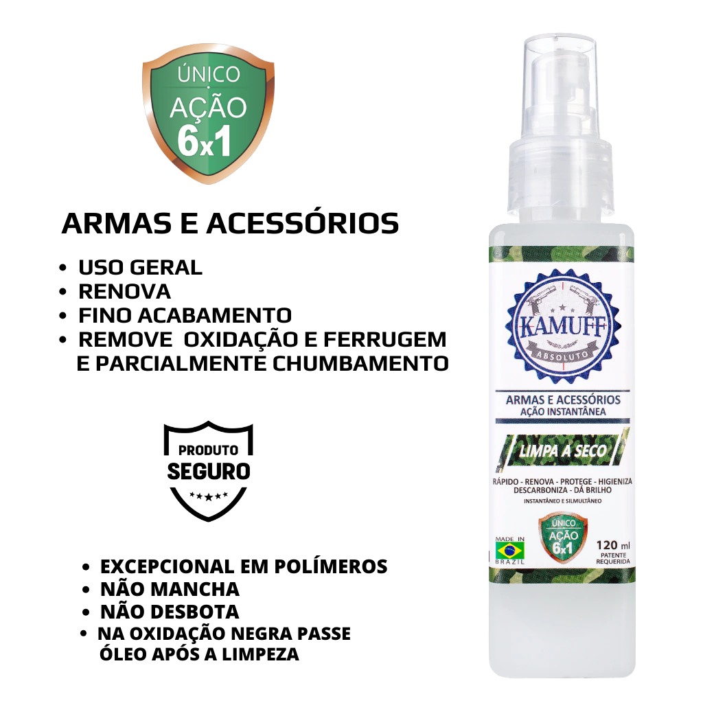 O primeiro limpador a seco ecológico para armas. Único 6x1 do mercado - limpa, desengordura, desengraxa, descarboniza, higieniza e dá brilho em operação instantânea e simultânea. Tem ainda ação sobre odores, oxidação e ferrugem. Produto seguro. Conceito: APLIQUE A NÉVOA SOBRE A SUPERFÍCIE E LIMPE ATÉ SECAR. Use escova macia se desejar. Faz remoção parcial de chumbamento. Produto a base d'água (na oxidação negra deve-se deixar integralmente seca). "Água é melhor limpador do planeta". Pode ser aplicado em quaisquer materiais ou ambiente, pois não libera gases, tendo efeito positivo na manutenção da saúde no médio e longo-prazos.