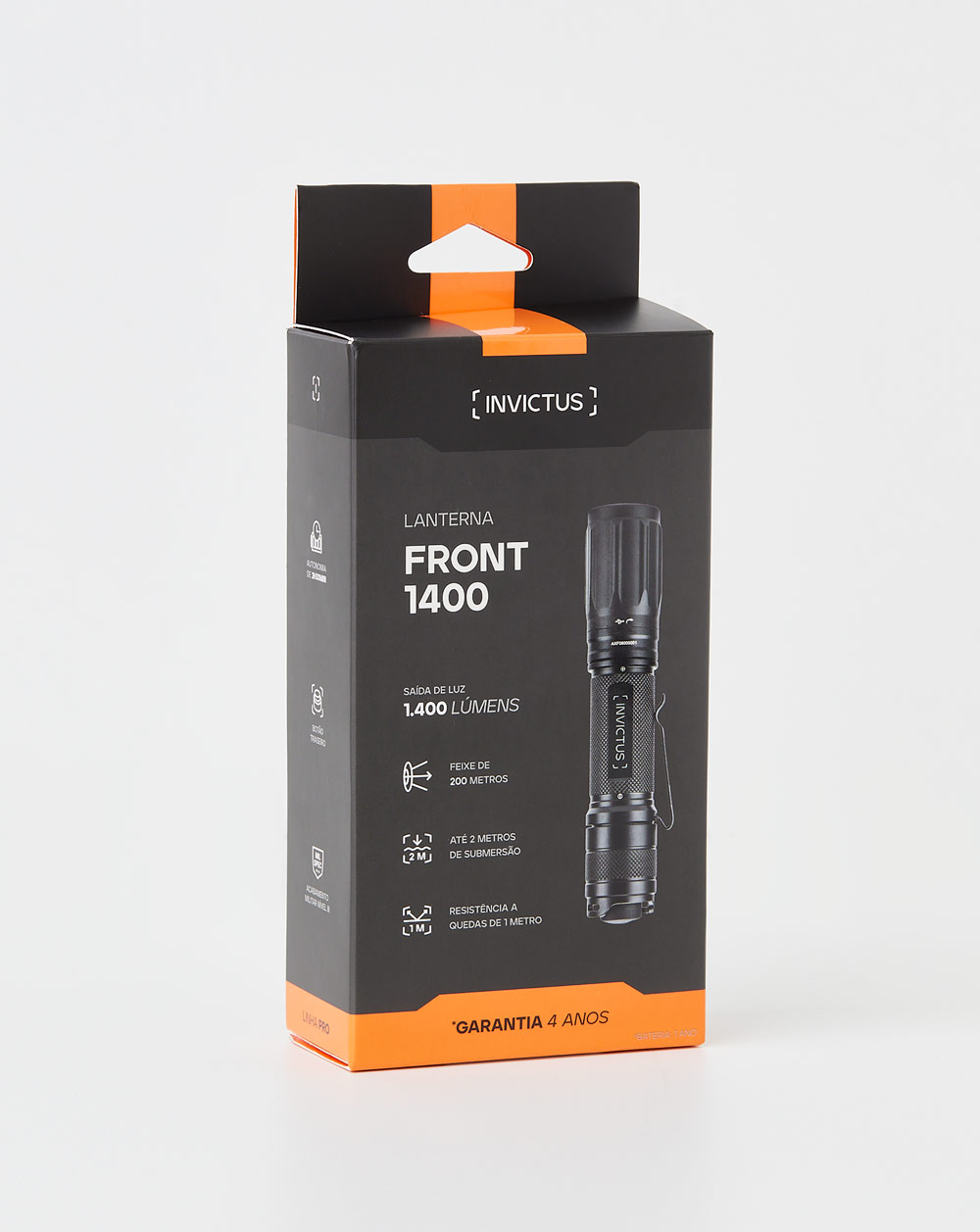 A Lanterna Tática Front 1400 INVICTUS é funcional e extremamente resistente. Ideal para o uso profissional, oferece confiabilidade em missões críticas em ambientes de baixa luminosidade. Equipada com LED OSRAM™ P9 de alta performance, tem capacidade luminosa de 1400 lumens, intensidade de 9500 candelas e alcance de feixe de luz de até 200 metros.
